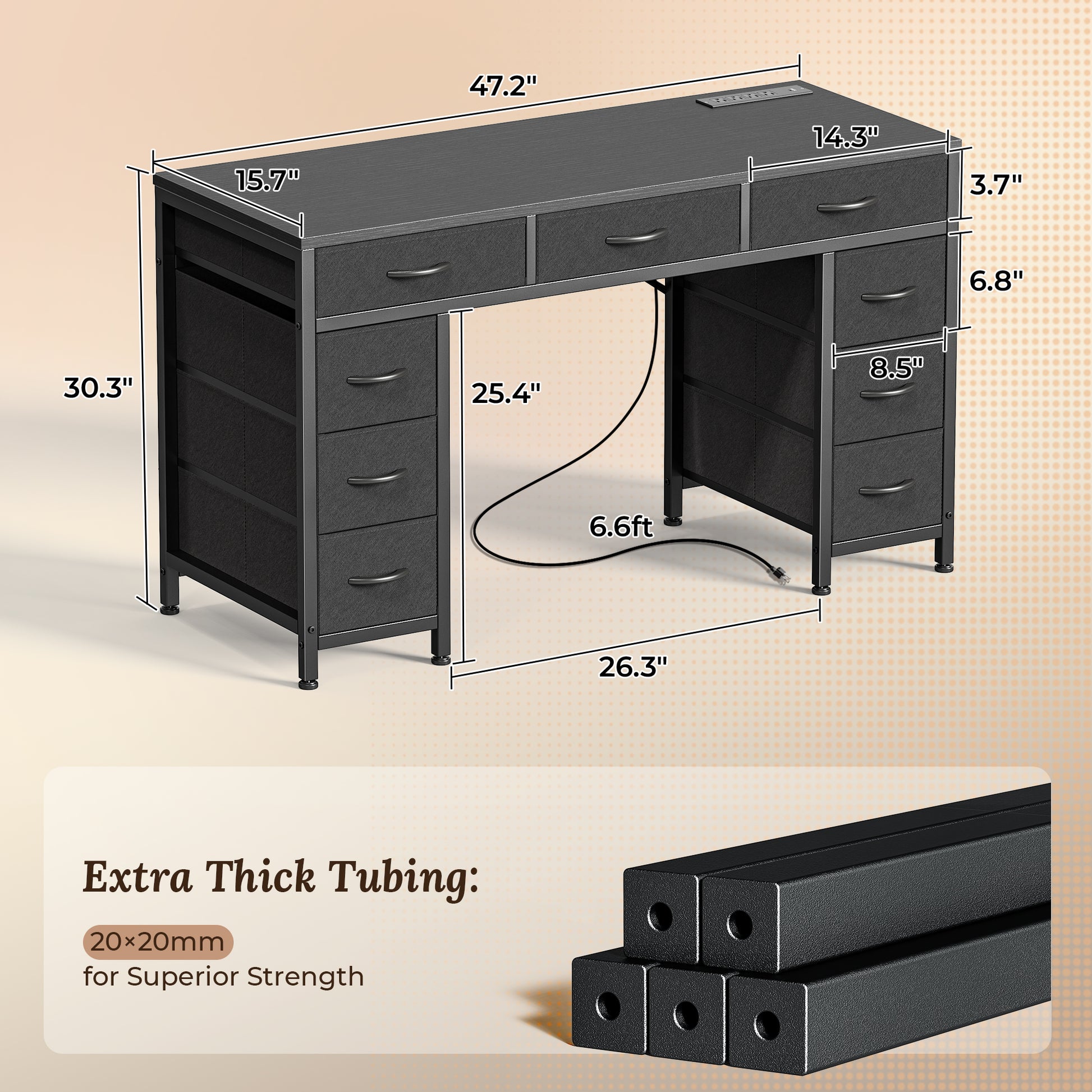 PRAISUN 47 Inch Office Desk with Outlets, Computer Desk with 9 Fabric Drawers, Writing Gaming Work Study Desk for Bedroom, Living Room, Home Office, Large Storage, Black