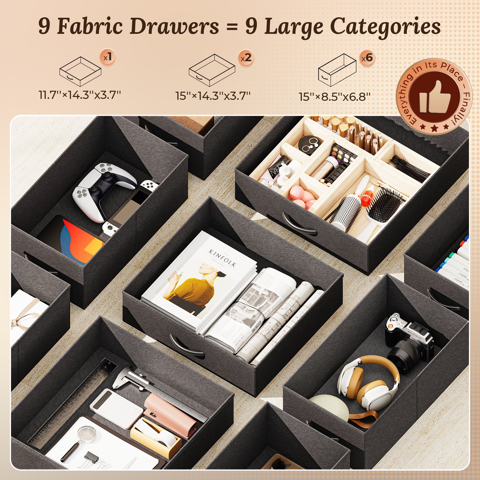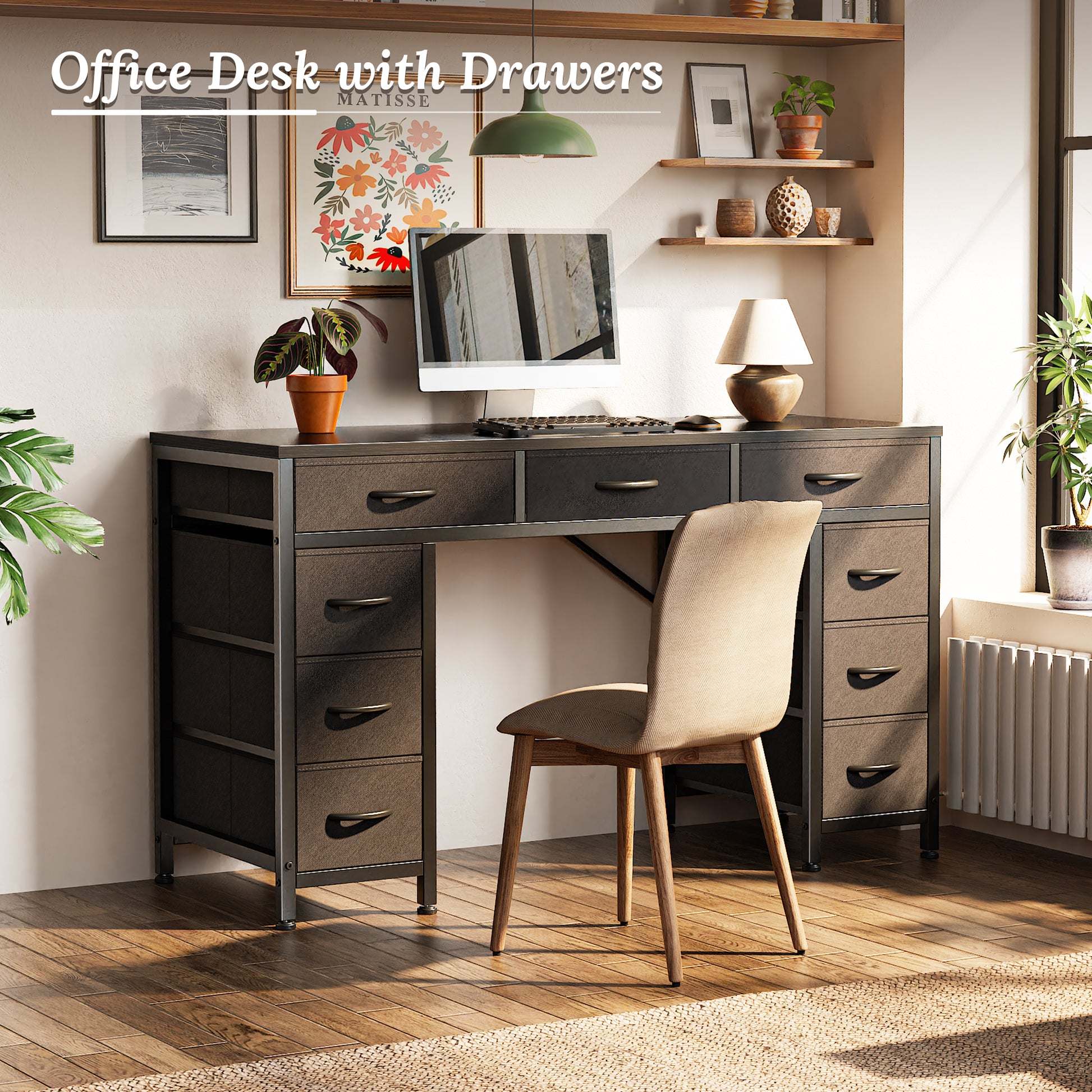 - 【9 Fabric Drawer Desk with Storage】With 9 drawers, 3 large ones right under the desktop and 6 smaller ones on both sides, you can organize everything easily with this corner computer desk. Drawer 1 for your notebooks and files, drawer 2 for your tech accessories, or drawer 3 for your makeup or crafting supplies... Everything stays neat, easy to find, and within arm’s reach