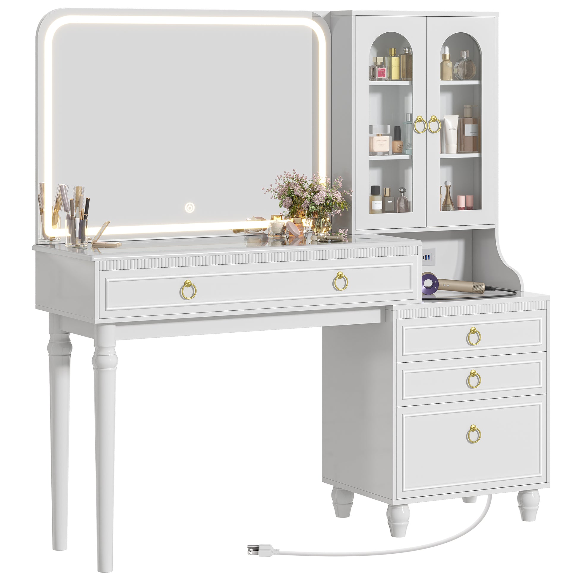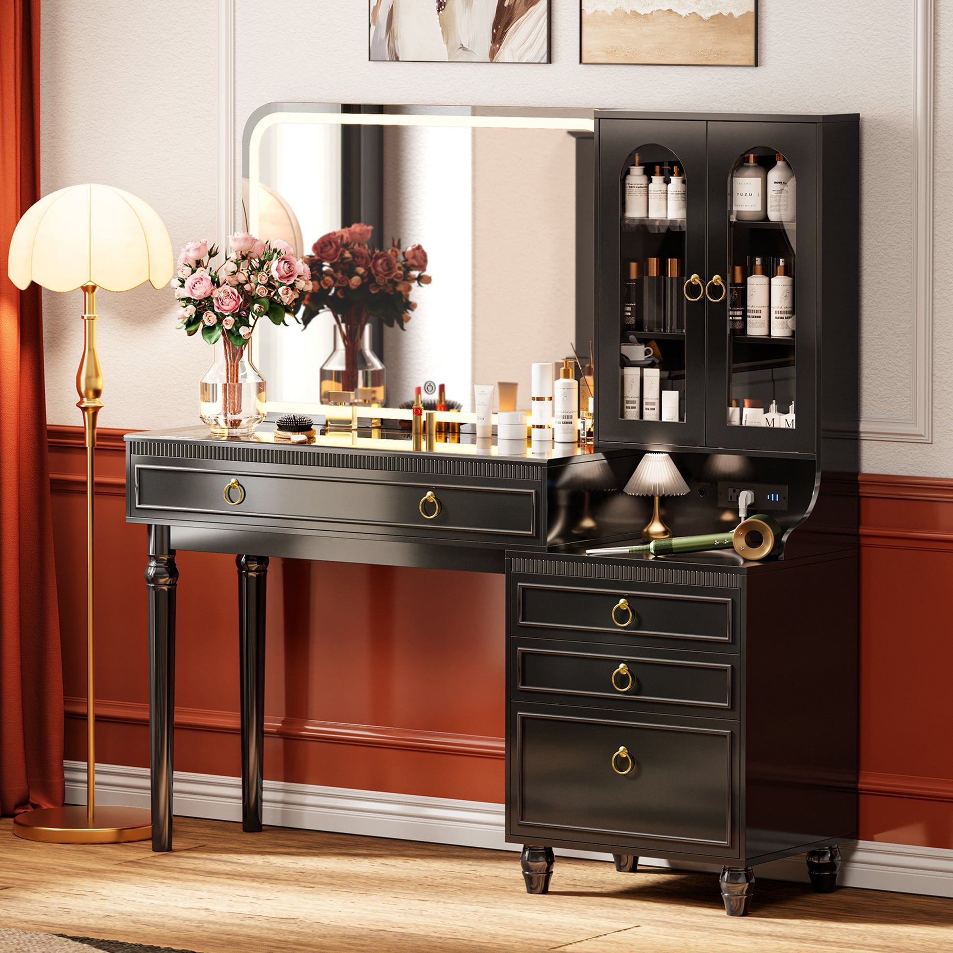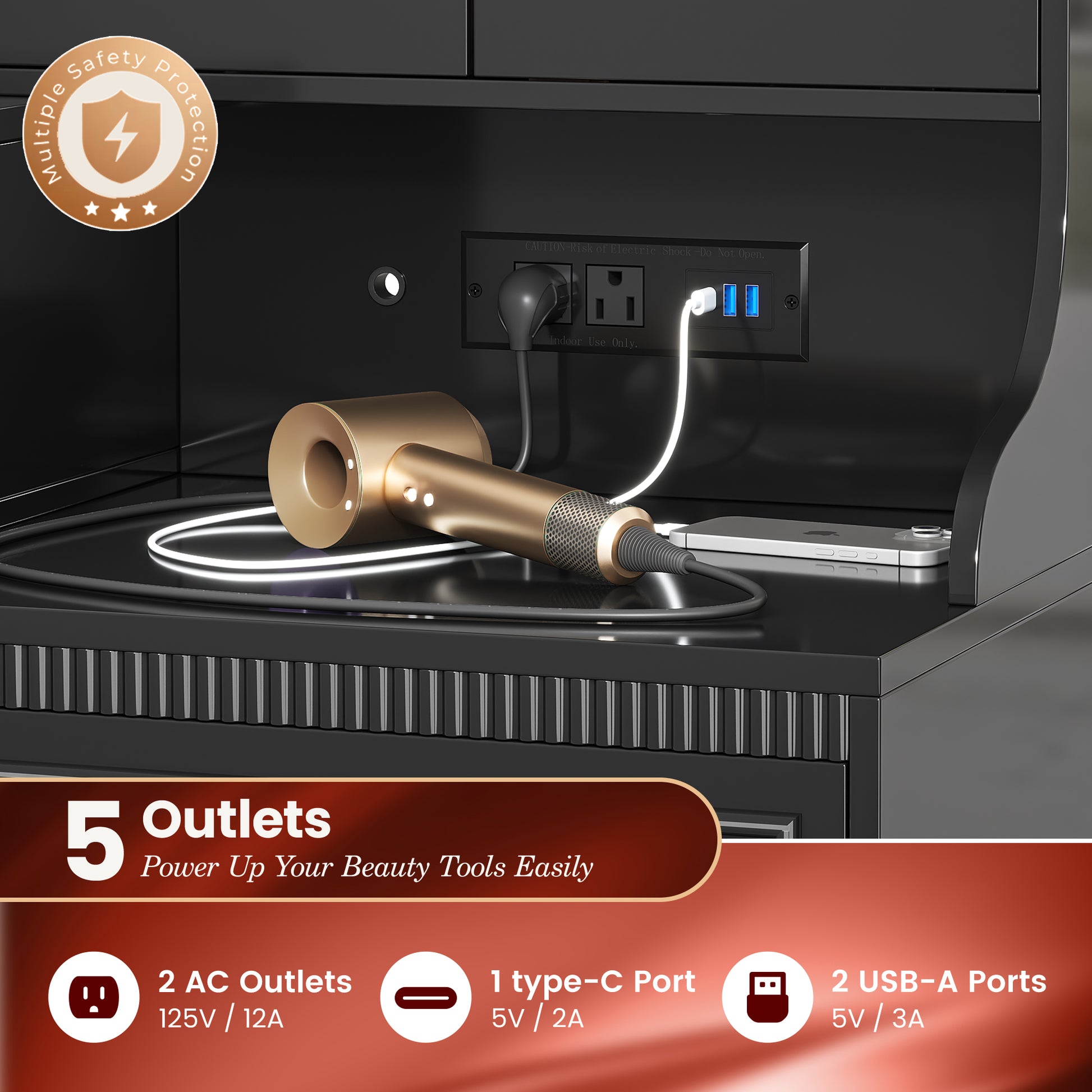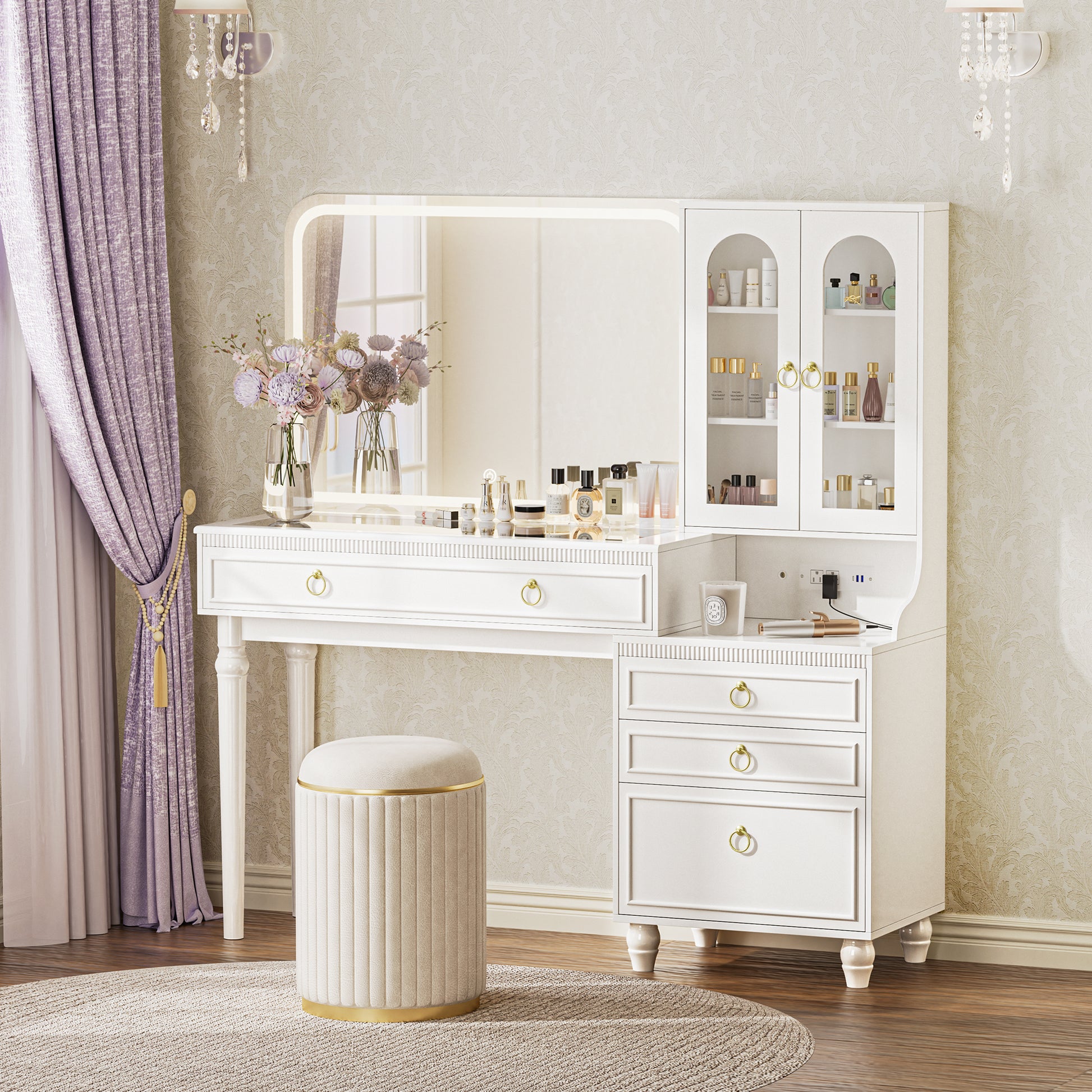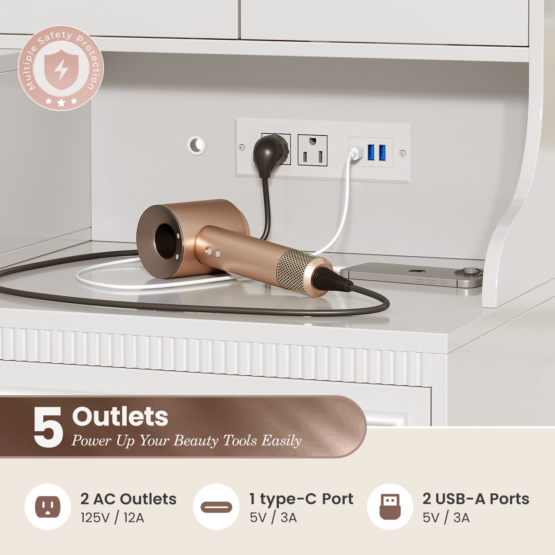 - 【Side Power Station】Designed with 2 AC outlets, 2 USB ports, and 1 Type-C port discreetly built into the side, this makeup desk keeps your tabletop clear and clutter-free. Easily charge your phone, tablet, or beauty tools, or plug in a hair dryer or curling iron—all within arm’s reach, without sacrificing makeup space