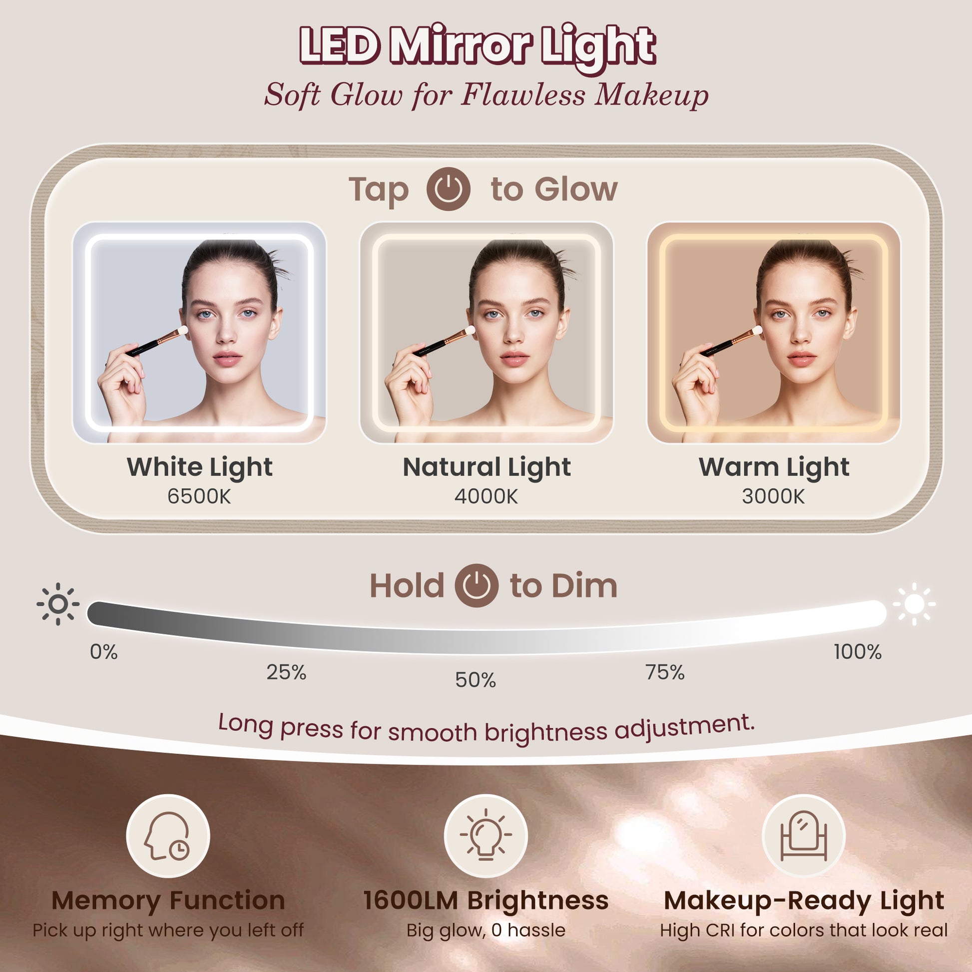 - 【Larger LED Mirror】This extra-tall LED mirror (32.6”L × 25.6”H) of the girls vanity provides bright yet soft lighting for users of all heights. With tap-to-glow controls, you can easily switch between Warm (3000K), Natural (4000K), and White (6500K) modes, or long press to smoothly adjust brightness. The memory function saves your last setting, while 1600LM high-CRI lighting delivers powerful, natural illumination that keeps makeup colors true-to-life