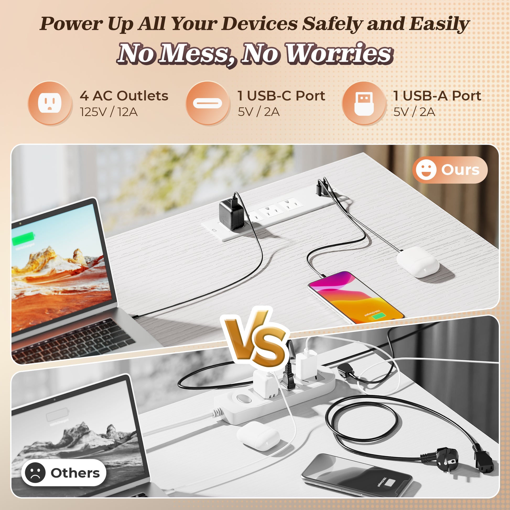 - 【L Shaped Gaming Desk with Charging Station】Charge all your office or gaming devices right at your pc desk: 4 AC outlets, 1 USB-A, and 1 USB-C port handle your laptop, monitor, phone, tablet, speaker, or even a desk lamp – no more crawling under the desk for plugs
