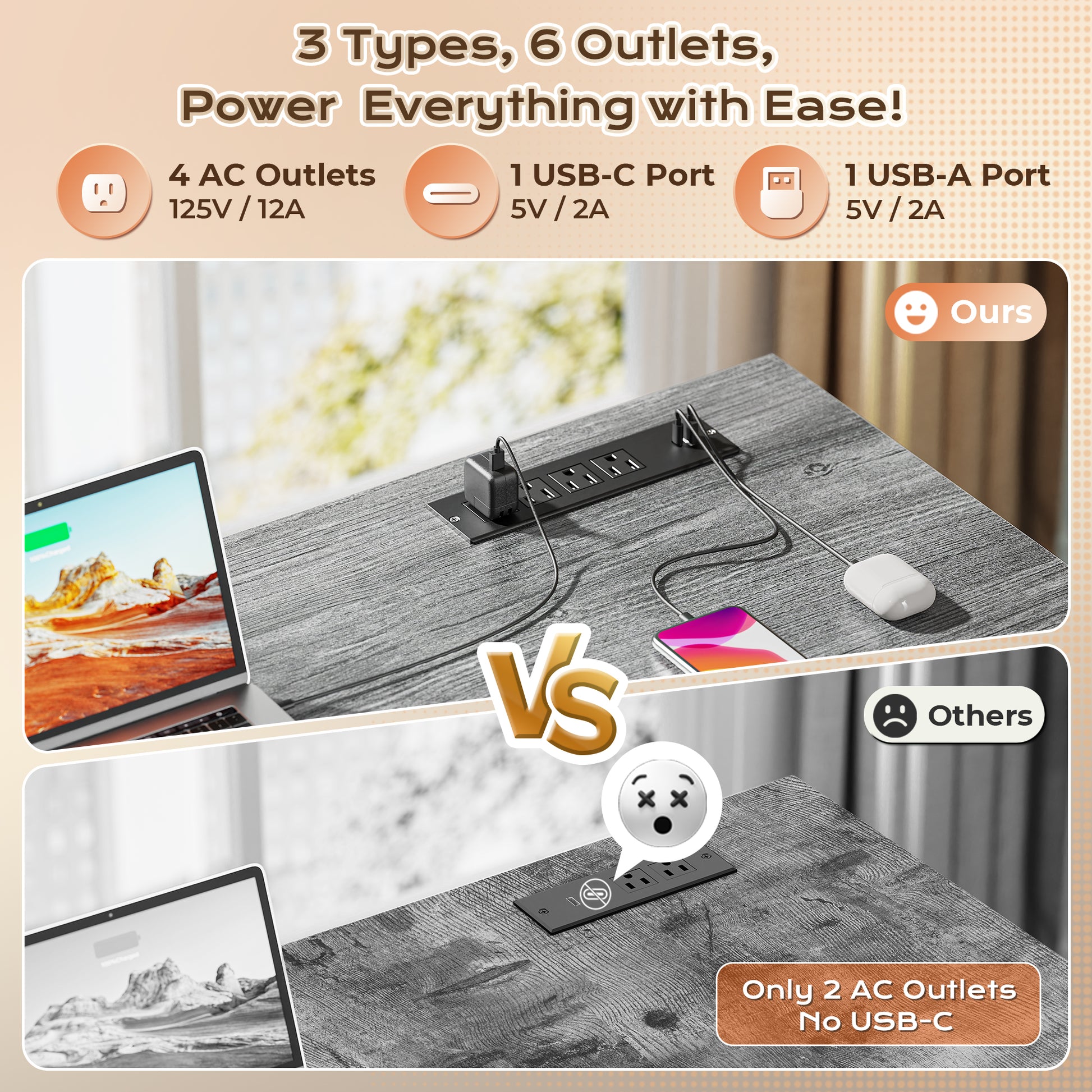 - 【Computer Desk with Charging Station】This large office desk features a built-in power strip with 4 AC outlets, 1 USB-C port, and a USB-A port, perfect for powering your laptop, tablet, phone, or smart lamp without messy extension cords. The USB-C port is convenient for charging newer devices