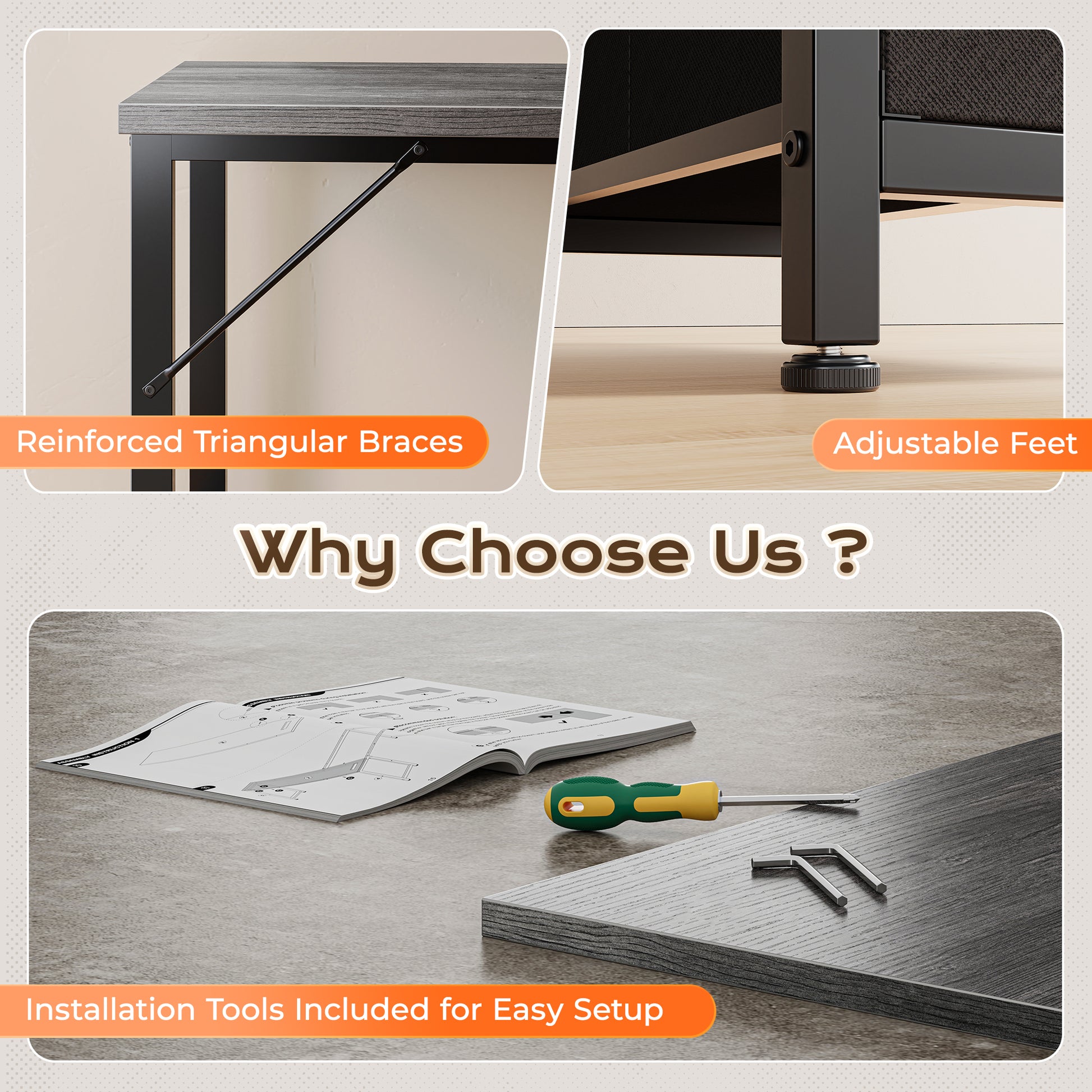 - 【Solid Construction for Everyday Use】Made with durable particle board and reinforced steel tubing (20mm thick under the main desk), this large desk withstands long time. The crossbar on the back adds extra stability, while the open space beneath the side desk gives your legs room to stretch, or even place a small pet bed for your furry coworker